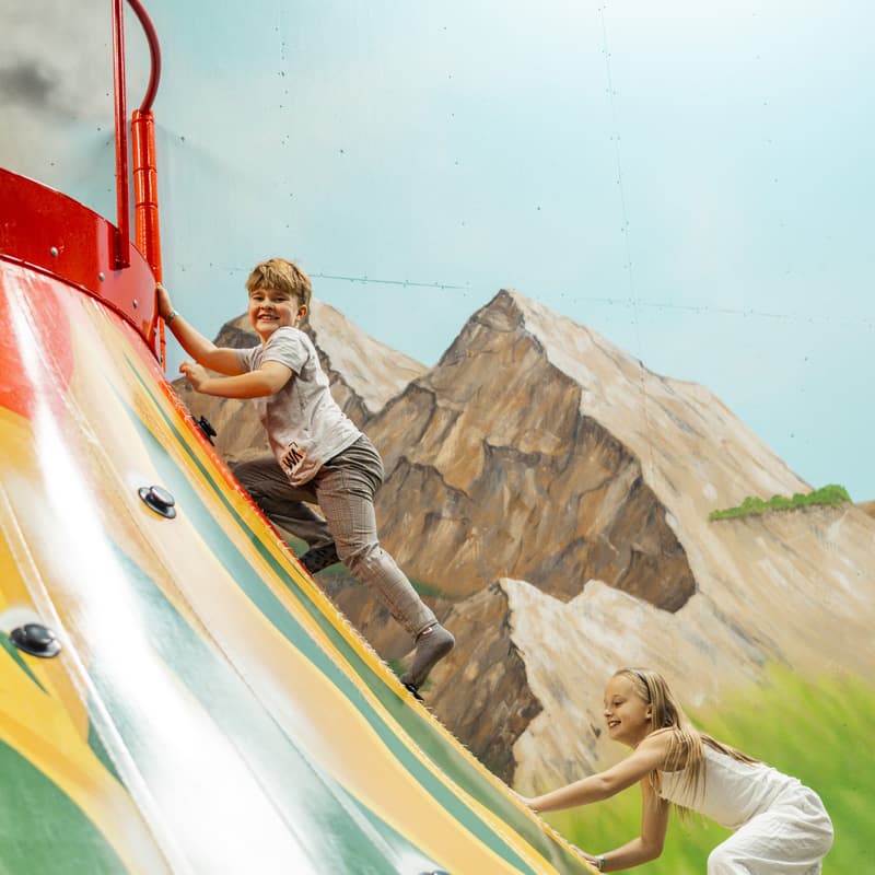 Tulivuoren huipulta avautuu upea näkymä leikkimaahan. Näet pitkälle pallomereen, seepraliukumäkeen ja pienten alueelle asti! Liu’u alas pitkää liukumäkeä, nauti jännittävästä ja kutkuttavasta tunteesta ja kiipeä ylös uudestaan. Treenaat samalla ihan huomaamatta!