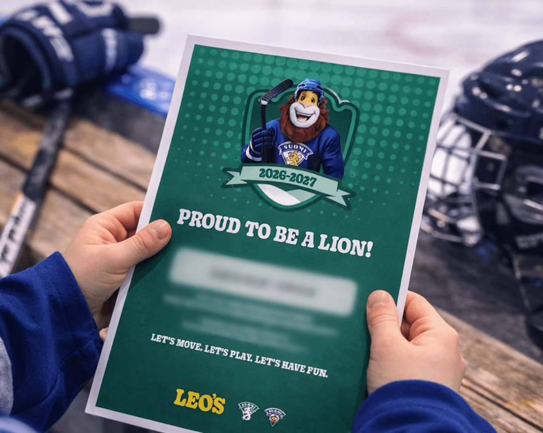 Kiekkokoulun alku on iso hetki pienelle pelaajalle – ja Leo’s tuo siihen ripauksen lisää iloa. Starttipaketti tekee ensiaskeleista jäällä entistä hauskempia ja vahvistaa yhteenkuuluvuuden tunnetta. Mukana on osallistumisdiplomi, oma pelaajakortti, kotitreenivihko sekä laukkutagi ja kypärätarra – pieniä mutta merkityksellisiä juttuja, jotka saavat hymyn huulille ja fiiliksen kattoon heti kauden alussa.